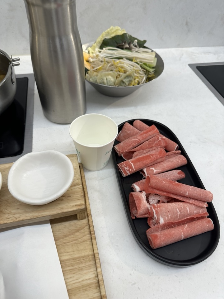 육수와 시킨 고기 다양한 소스와 함께 샤브샤브를 즐길 수 있습니다.