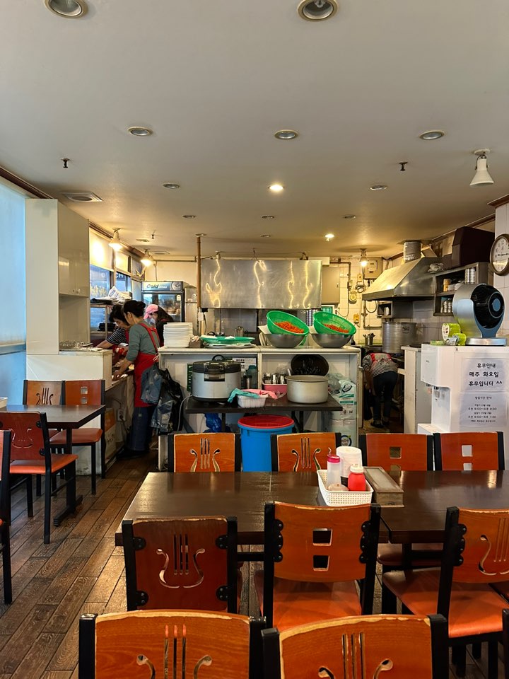 홀내부에 먹고갈 자리도 충분하며, 직원들이 분주하게 냉면 및 김밥을 말고 있는 모습을 볼 수 있습니다.
