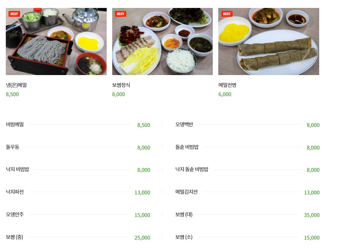 기본 메뉴는 냉메밀, 비빔메밀, 온메밀, 메밀막국수, 보쌈정식, 수제돈까스, 돌냄비우동이 있습니다.