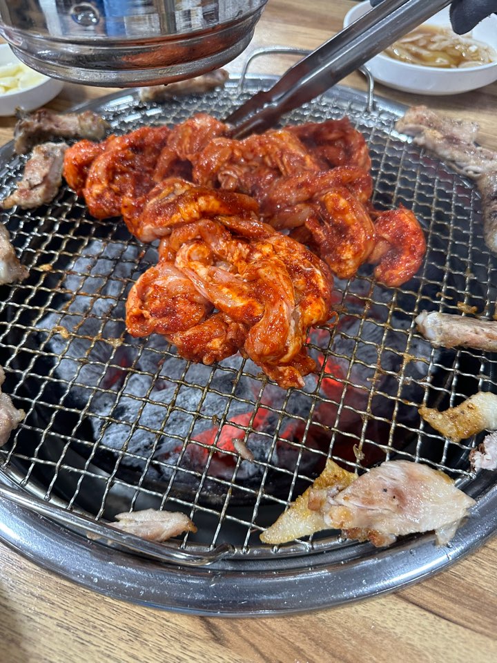 알맞운 굽기로 소금 닭갈비가 익어가고 있습니다.