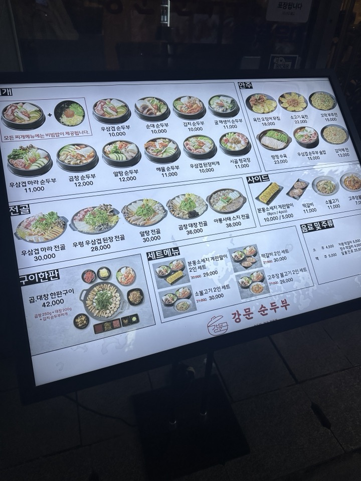 다양한 종류의 순두부를 취급하면서 깊고 진한 맛의 순두부찌개를 지향하는 강문순두부 종각점에 대한 포스팅입니다. 점심에는 간편하게 순두부를 즐길 수 있고, 저녁에는 회식 및 단체 식사가 가능한 메뉴인 전골 및 곱창 한판구이 등 다양한 음식들을 취급한다고 합니다.