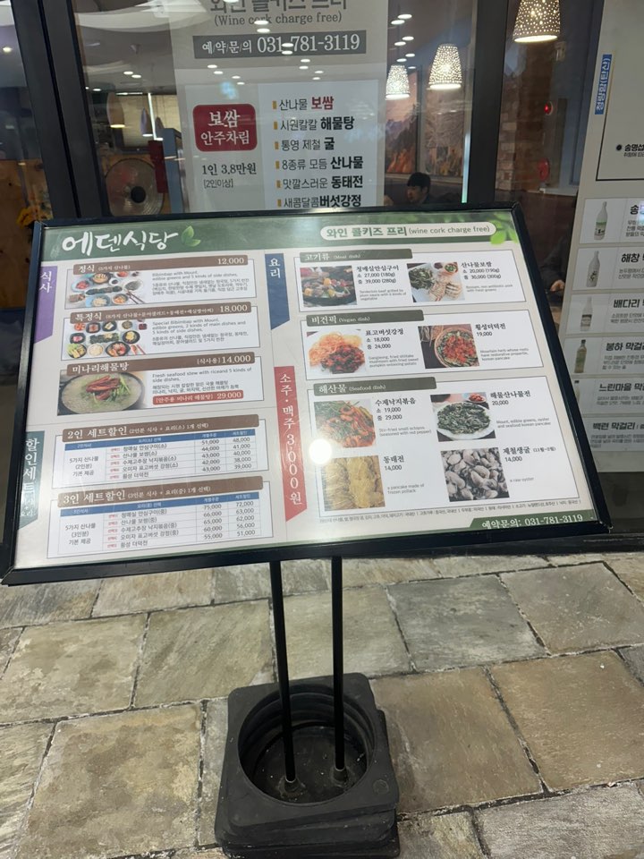 점심메뉴 외에도 저녁에도 회식으로 즐길 수 있는 다양한 세트들이 준비되어 있는 에덴식당입니다