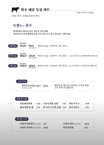 - 식사 메뉴: 갈비와 곁들이기 좋은 냉면, 된장찌개, 누룽지 등 다양한 식사 메뉴가 준비되어 있습니다.