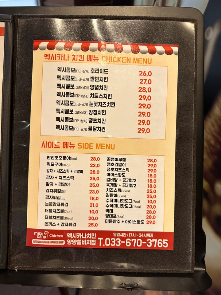 양양 쏠비치 멕시카나의 메뉴는 보통에 있는 멕시카나의 메뉴와 같습니다. 요즘 멕시카나에서 유행하는 치토스 치킨도 있습니다.